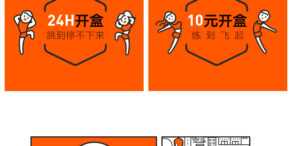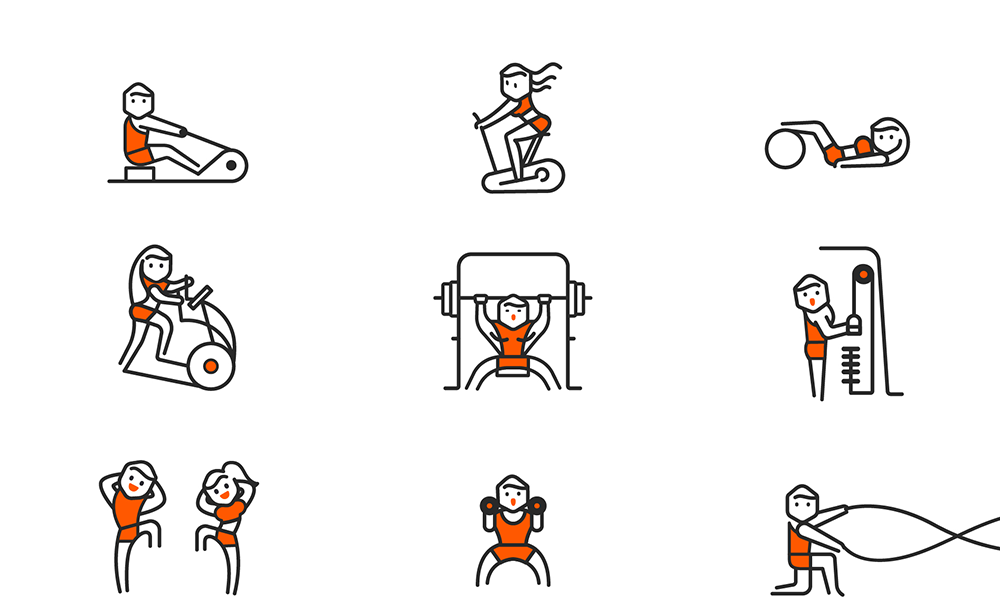 2)产品品牌记忆点 不会使用器械,是小白健身用户的痛点之一。我们将器械教学在产品设计中前置,并且设计了一套运动小人儿来表现器械类别。教学小人儿热爱卖萌,身材并非魁梧魔鬼但拥有一副得到好身材的决心,就像是潜在健身用户的心理写照。在 toC 产品界面越来越理性、趋同、模块化的趋势下,轻松有趣的视觉表现,让产品更具记忆点。